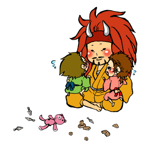 お館様を取りあう弁丸と佐助。